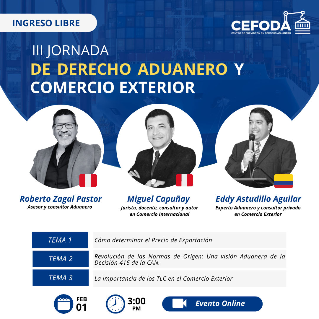 Una jornada aduanera que abordará el precio de exportación, las Normas de Origen en la Decisión 416 de la CAN y la importancia de los TLC en el comercio exterior.